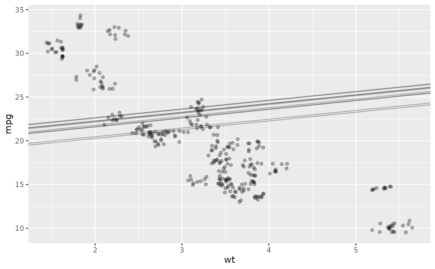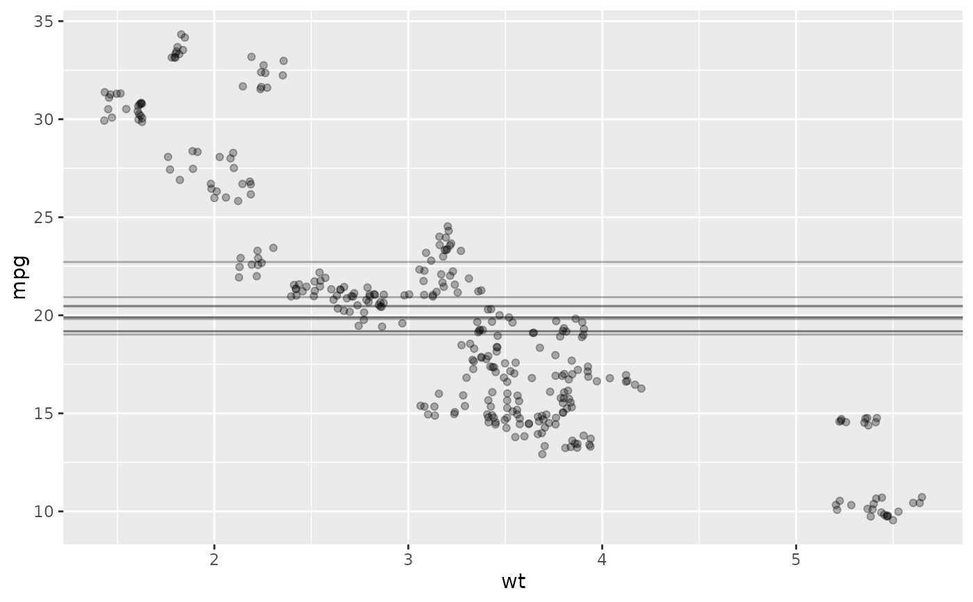 q + geom_abline_sample(intercept = dist_normal(20, 1), alpha=0.3) # ggdibbler