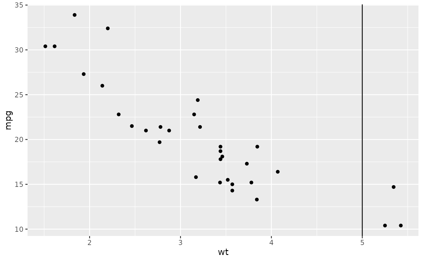 p + geom_abline(intercept = 37, slope = -5) # ggplot