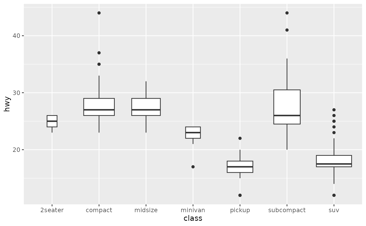 q <- ggplot(uncertain_mpg, aes(class, hwy))
