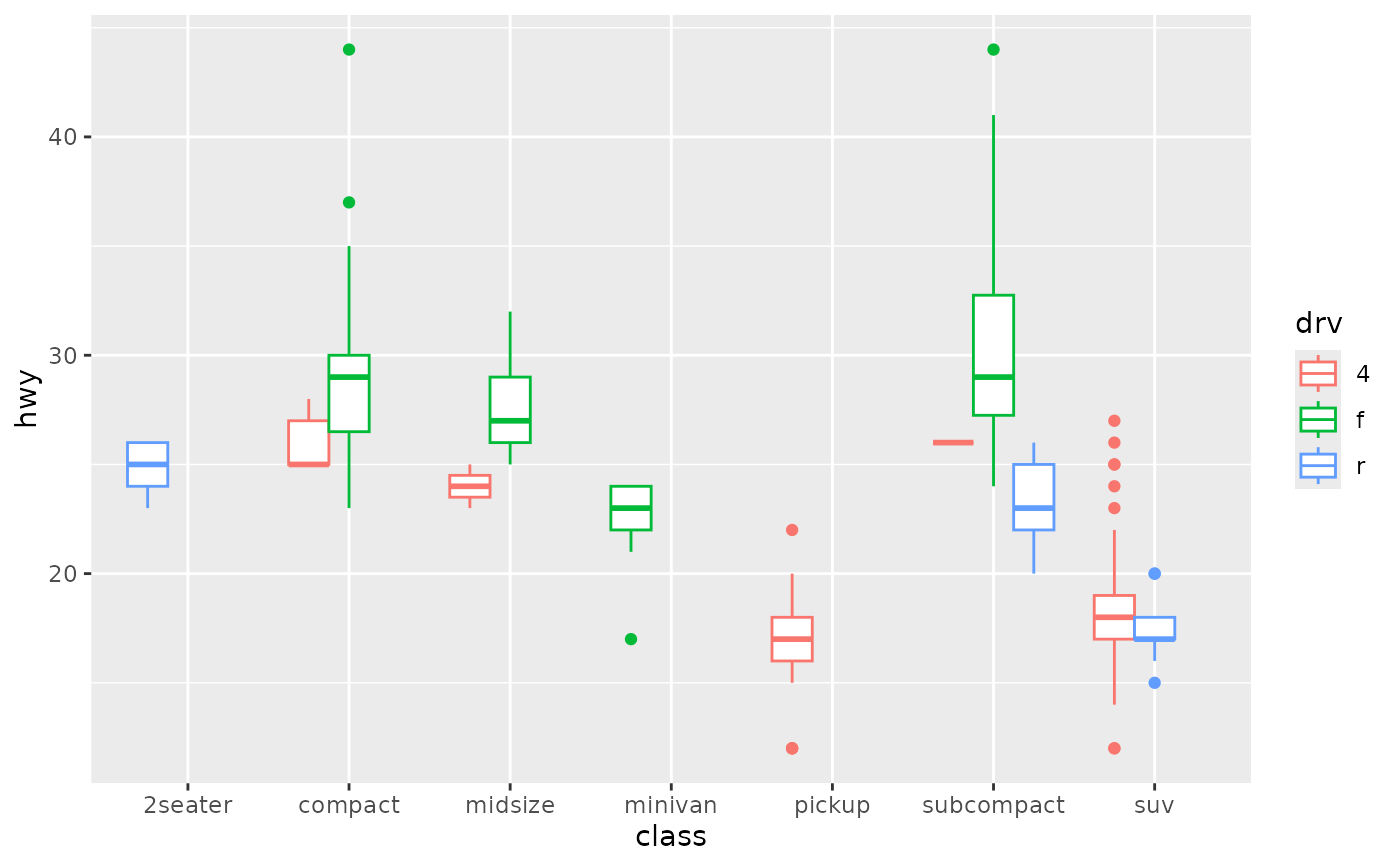 p + geom_boxplot(aes(colour = drv), position = position_dodge(preserve = "single"))