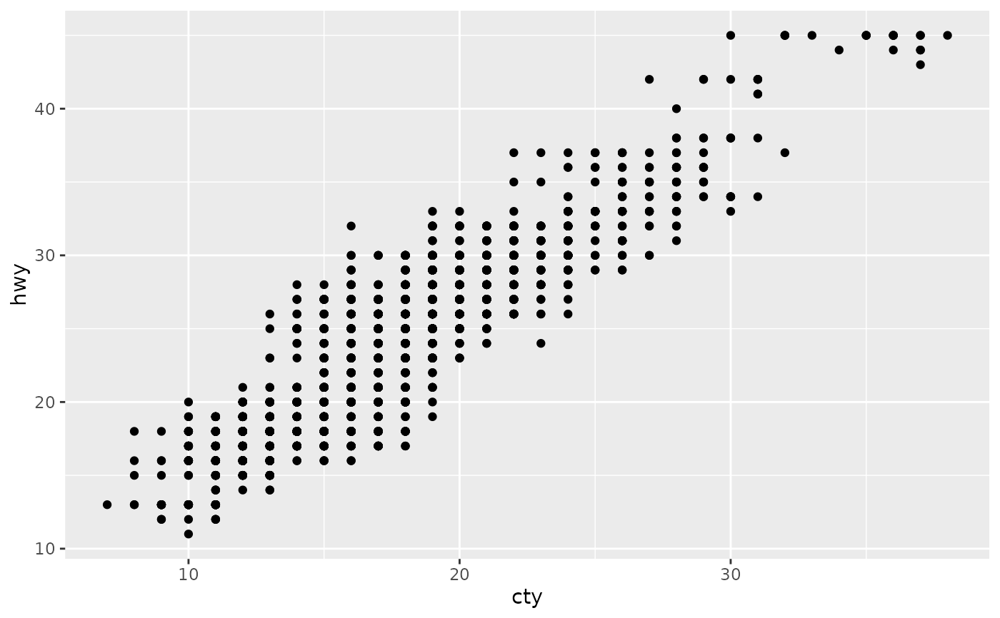 ggplot(mpg, aes(cty, hwy)) +