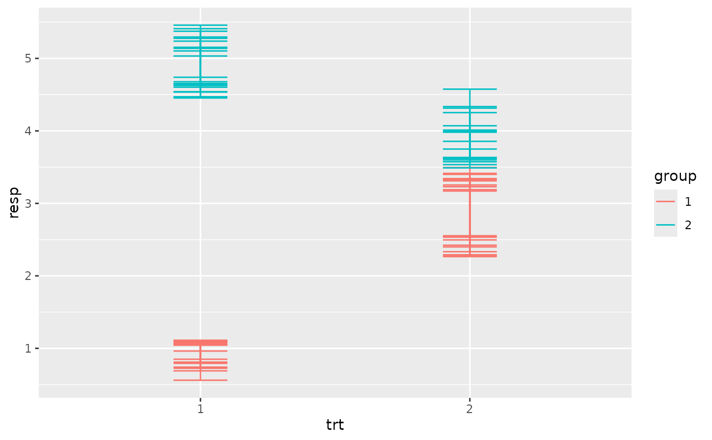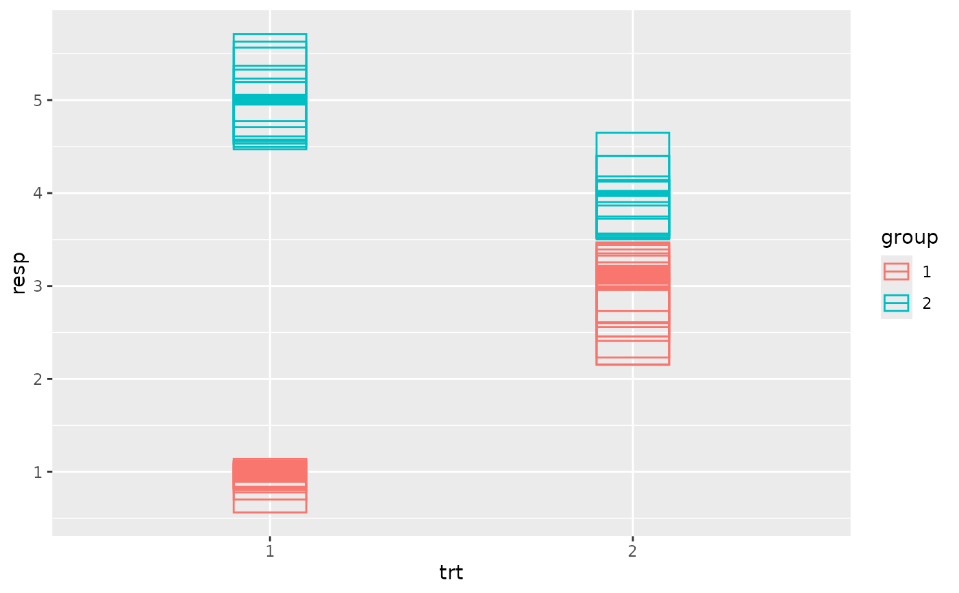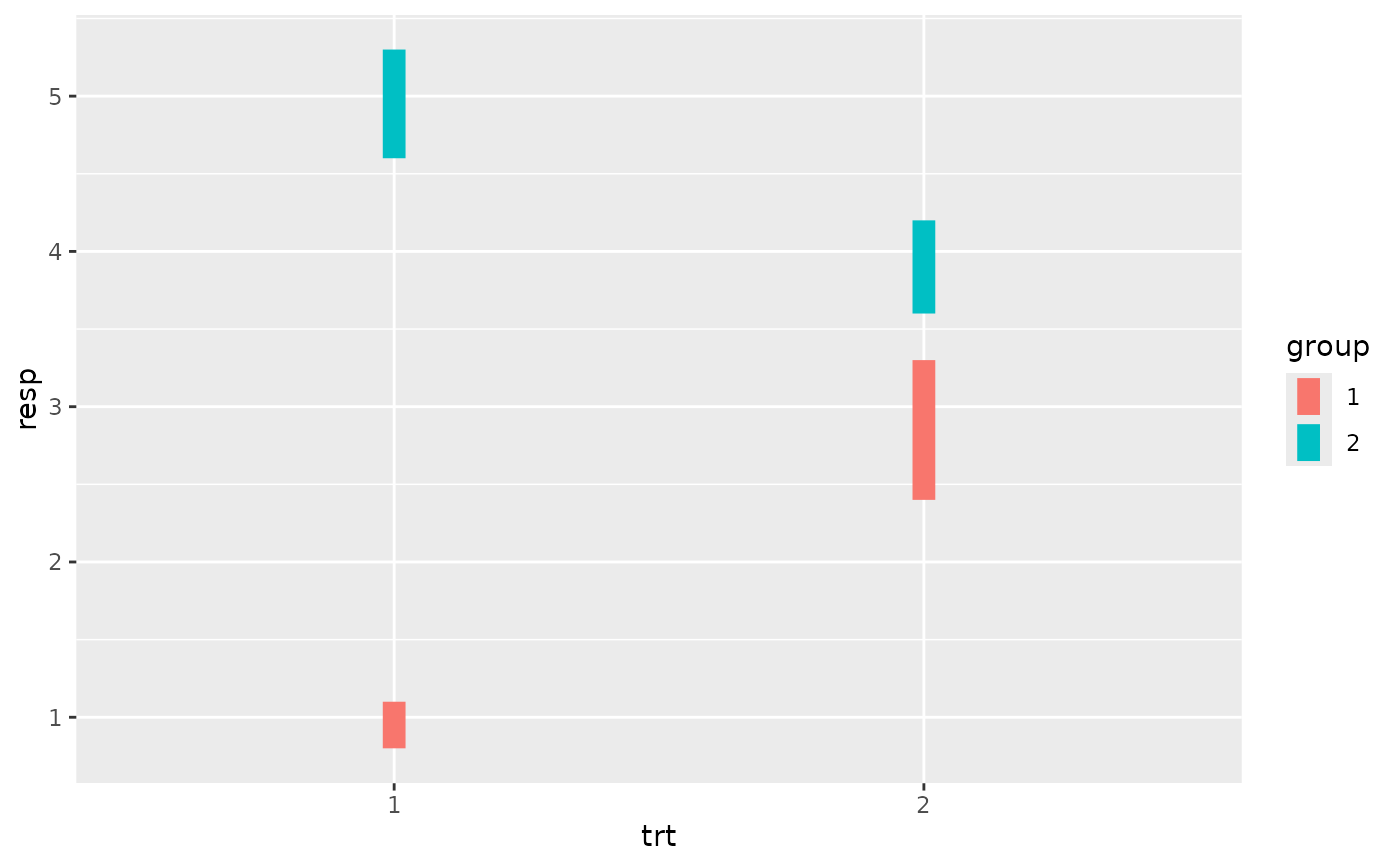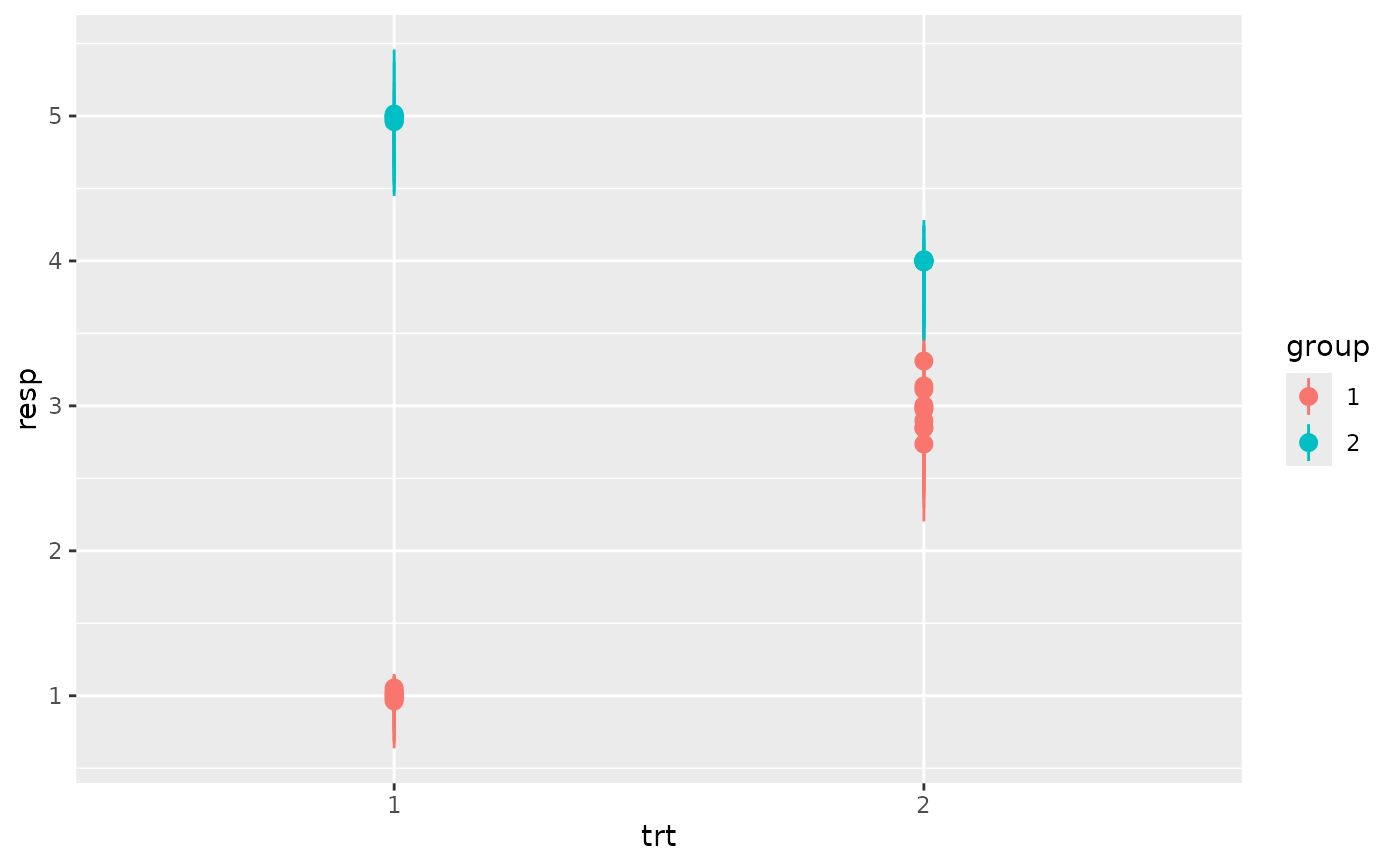 p <- ggplot(df, aes(trt, resp, colour = group))