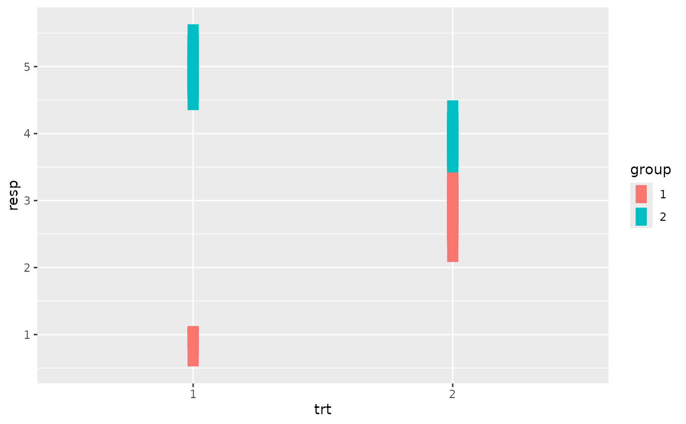 q <- ggplot(uncertain_df, aes(trt, resp, colour = group))