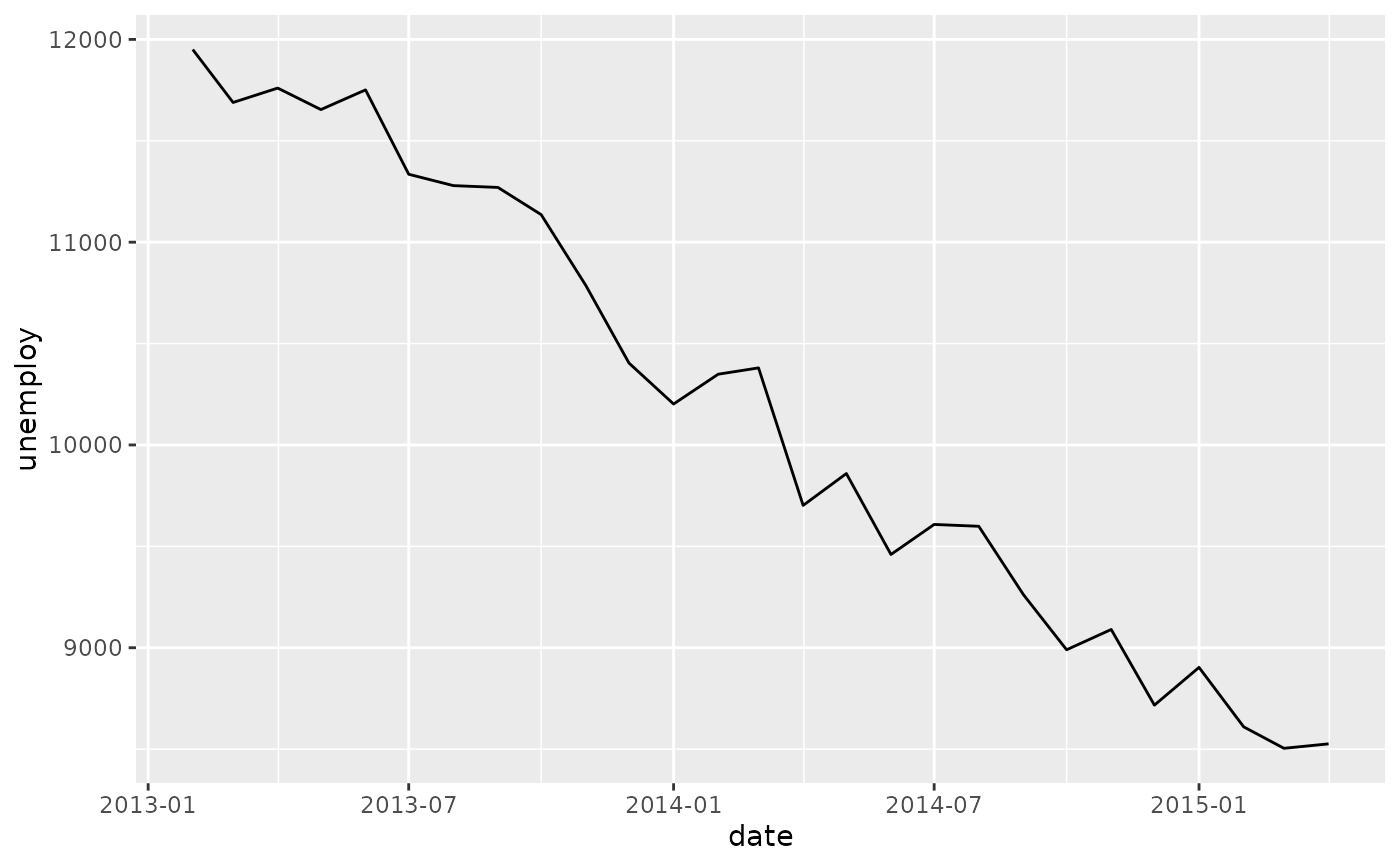 ggplot(recent, aes(date, unemploy)) + geom_line() #ggplot