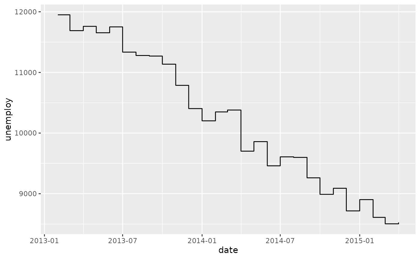 ggplot(recent, aes(date, unemploy)) + geom_step() #ggplot