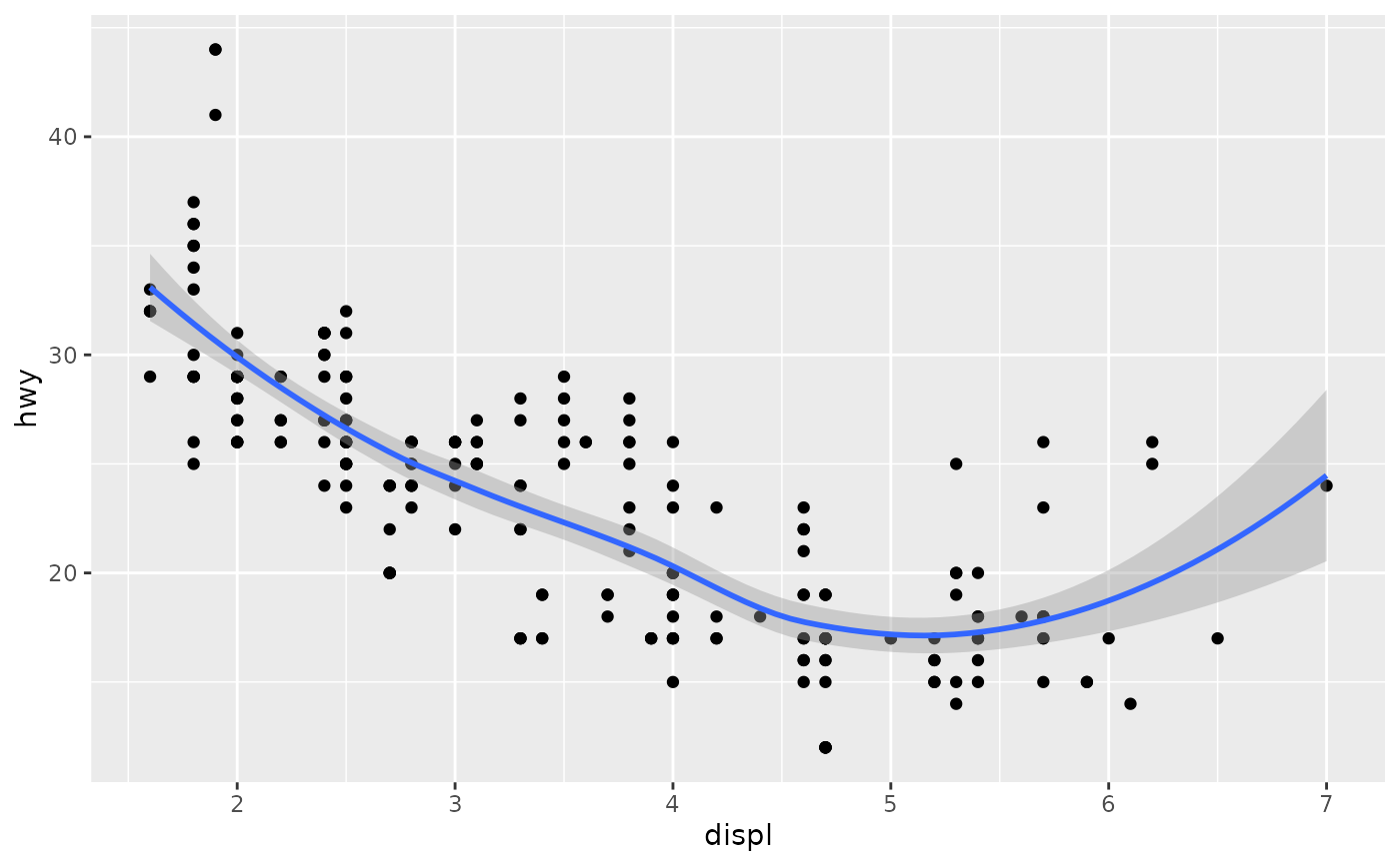 method = NULLthe smoothing method is chosen based on the size of the largest group (across all panels).stats::loess()is used for less than 1,000 observations; otherwisemgcv::gam()is used withformula = y ~ s(x, bs = "cs")withmethod = "REML". Somewhat anecdotally,loessgives a better appearance, but is \(O(N^{2})\) in memory, so does not work for larger datasets.If you have fewer than 1,000 observations but want to use the same