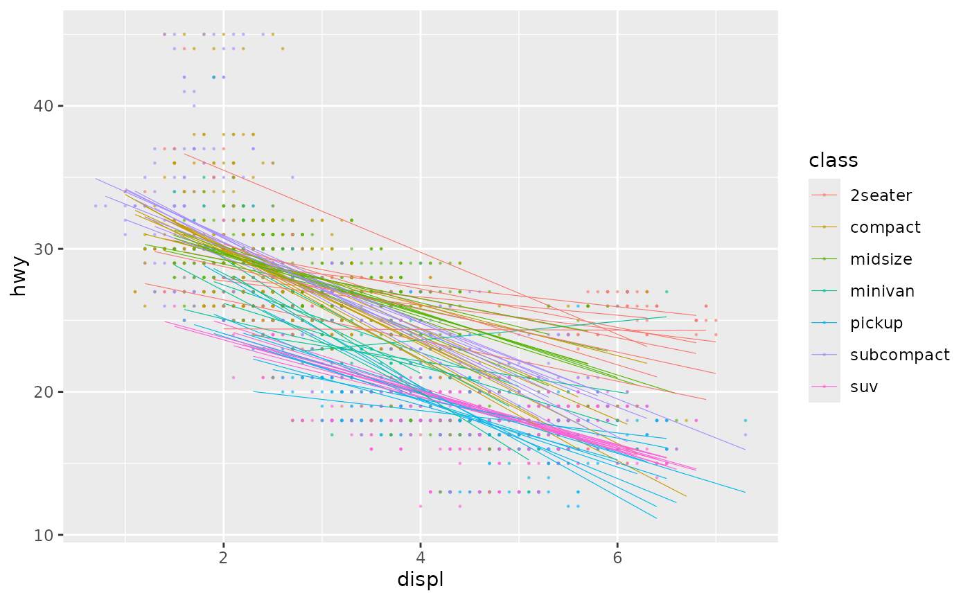 ggplot(uncertain_mpg, aes(displ, hwy, colour = class)) +